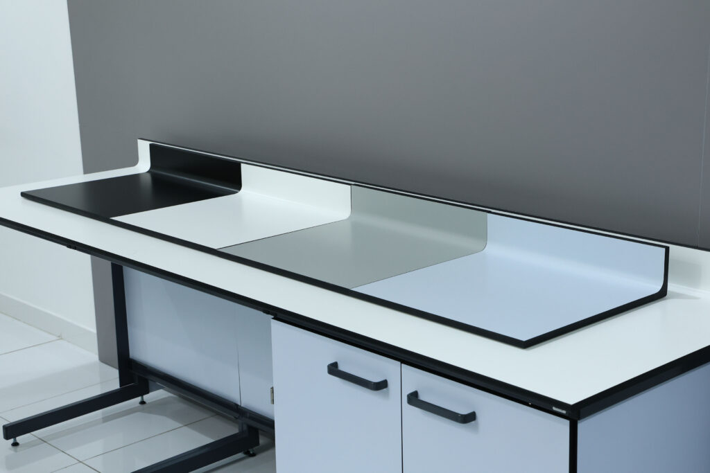 Our seamless worksurfaces with integrated backsplash, fabricated from a single sheet of Trespa or other premium materials, eliminate these vulnerabilities. Designed as one continuous surface, they deliver superior hygiene, long-term durability, and unmatched compliance with global laboratory standards.